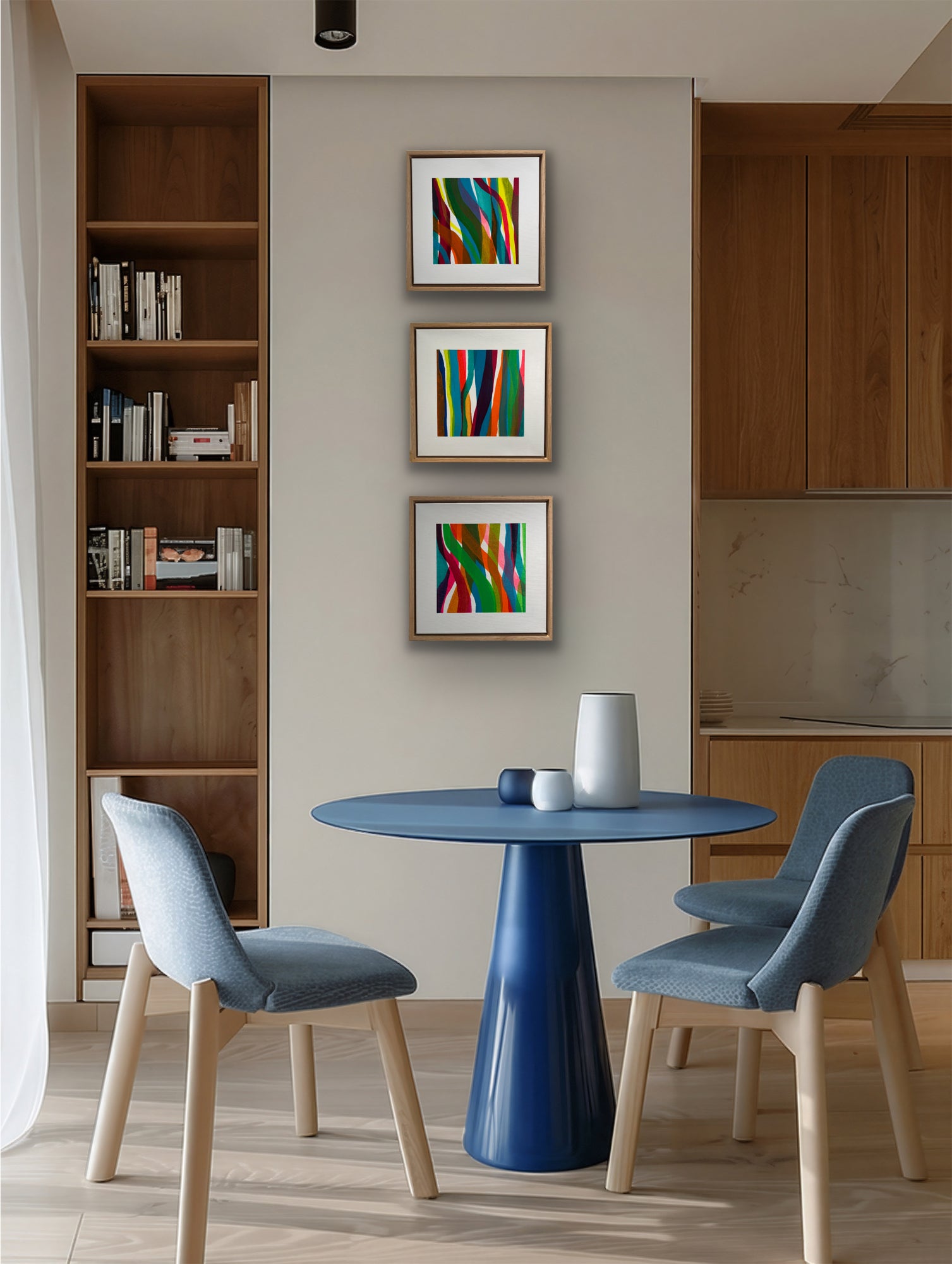 Vivid ribbons of colour interlace like threads on a loom. The curving bands create depth and dimension, suggesting fabric, light, or flowing water within crisp white borders. This trio works horizontally, vertically, or in a configuration of your own.