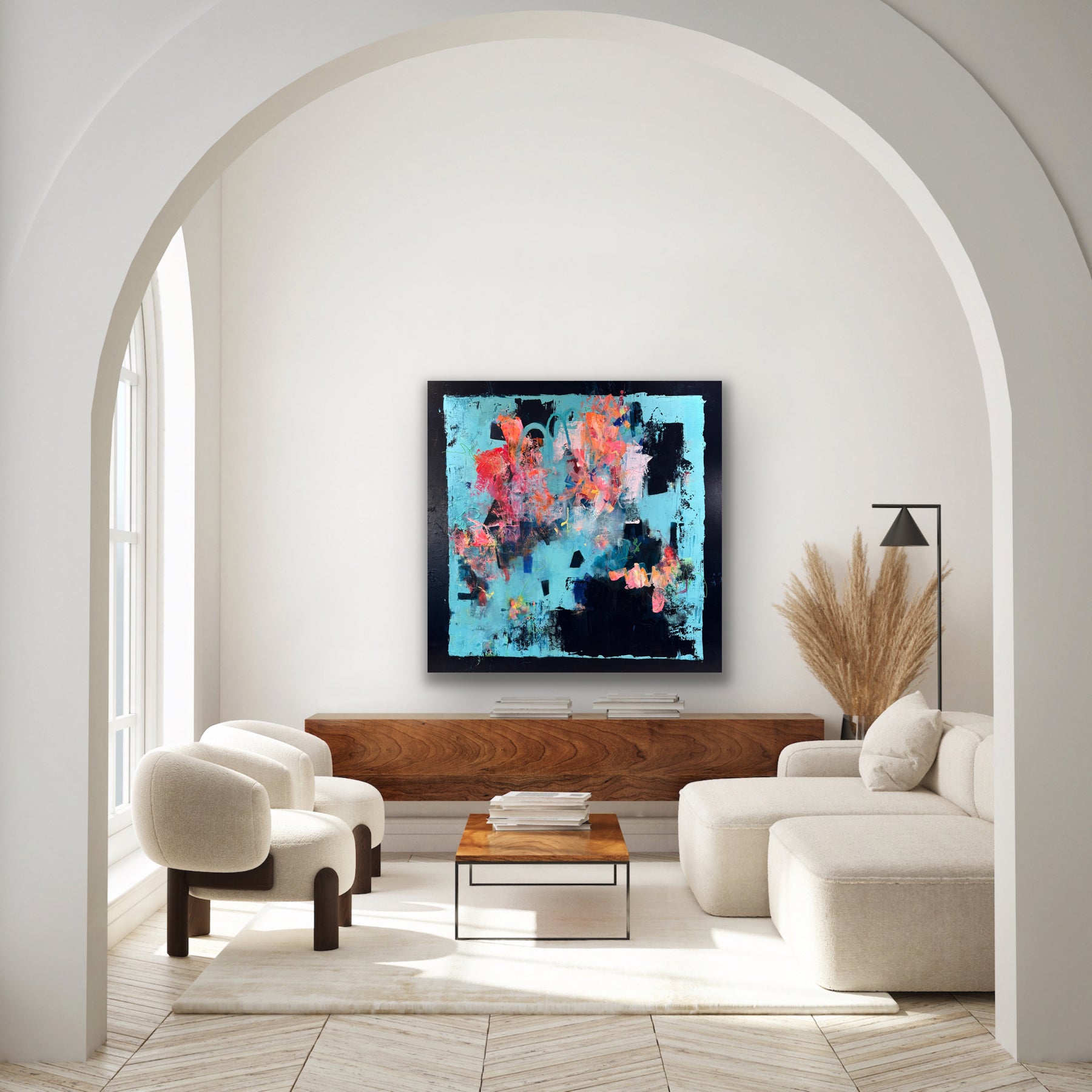 In our imaginations, anything is possible. In this painting, sporadic bursts of pink and orange are anchored by geometric shapes in darker complementary colours. A closer look reveals random scribbles and lines hiding among bold strokes and textures, echoing the overall contrast of chaos and structure.